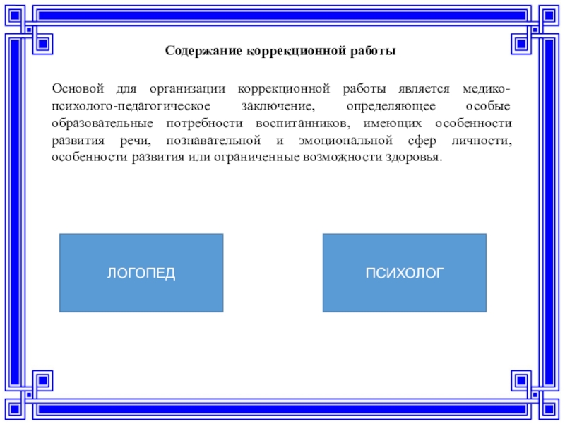 Основой для организации коррекционной работы является медико-психолого-педагогическое заключение, определяющее