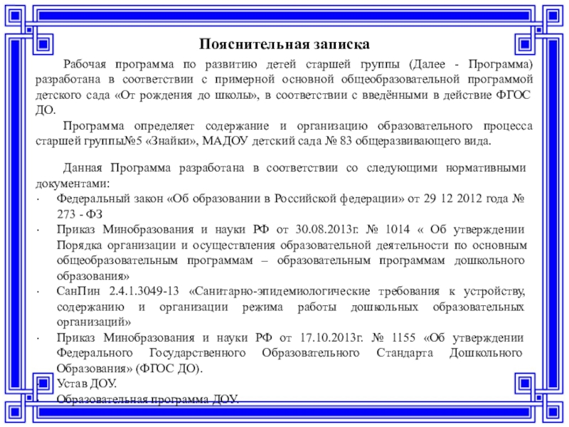 Программа определяет содержание и организацию образовательного процесса старшей группы№5 «Знайки», МАДОУ детский сада № 83 общеразвивающего вида.