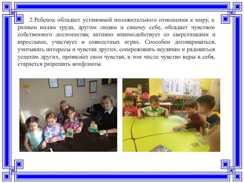 Слайд 62.Ребенок обладает установкой положительного отношения к миру, к разным видам труда,