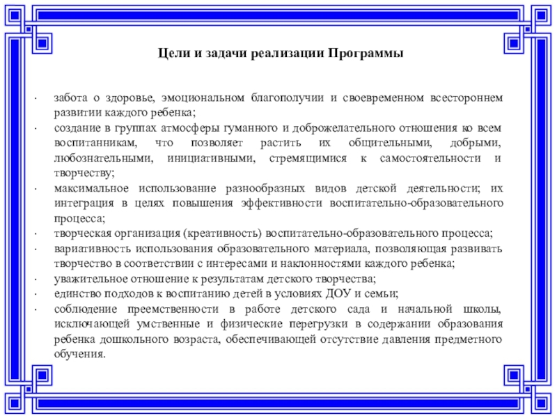 соблюдение преемственности в работе детского сада и начальной школы, исключающей умственные и физические перегрузки в содержании образования ребенка дошкольного возраста, обеспечивающей отсутствие давления предметного обучения.