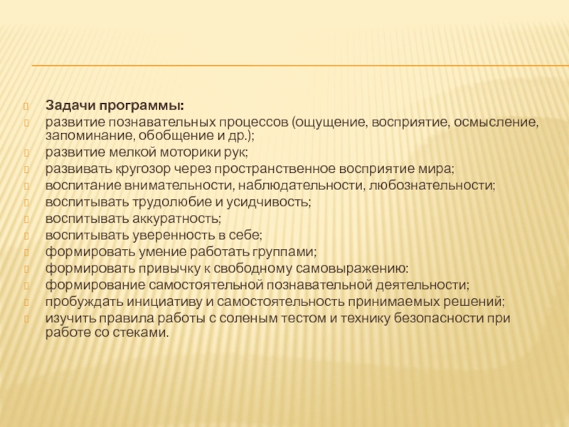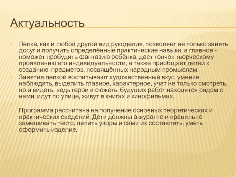 Программа рассчитана на получение основных теоретических и практических сведений. Дети должны аккуратно и правильно замешивать тесто, лепить узоры и сами их составлять, уметь оформить изделие.