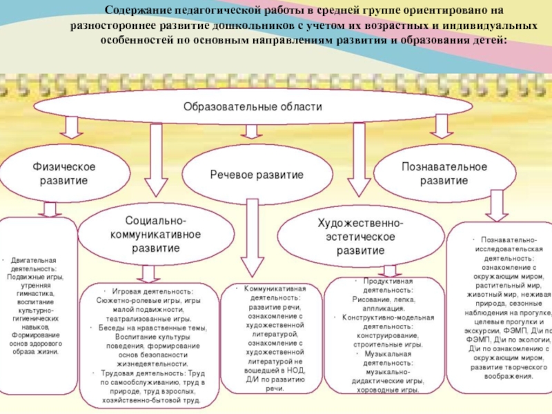 Слайд 6Содержание педагогической работы в средней группе ориентировано на разностороннее развитие дошкольников
