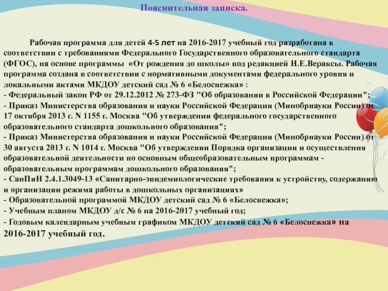 4-5 лет на 2016-2017 учебный год разработана в соответствии с требованиями Федерального Государственного образовательного стандарта (ФГОС), на основе программы «От рождения до школы» под редакцией Н.Е.Вераксы. Рабочая программа создана в соответствии с нормативными документами федерального уровня и локальными актами МКДОУ детский сад № 6 «Белоснежка» :