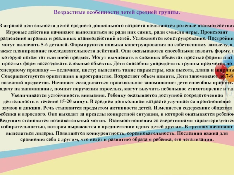 возраста появляются ролевые взаимодействия. Игровые действия начинают выполняться не ради них самих, ради смысла игры. Происходит разделение игровых и реальных взаимодействий детей. Усложняется конструирование. Постройки могут включать 5-6 деталей. Формируются навыки конструирования по собственному замыслу, а также планирование последовательности действий. Они оказываются способными назвать форму, на которую похож тот или иной предмет. Могут вычленять в сложных объектах простые формы и из простых форм воссоздавать сложные объекты. Дети способны упорядочить группы предметов по сенсорному признаку — величине, цвету; выделить такие параметры, как высота, длина и ширина. Совершенствуется ориентация в пространстве. Возрастает объем памяти. Дети запоминают до 7-8 названий предметов. Начинает складываться произвольное запоминание: дети способны принять задачу на запоминание, помнят поручения взрослых, могут выучить небольшое стихотворение и т.д. . Увеличивается устойчивость внимания. Ребенку оказывается доступной сосредоточенная деятельность в течение 15-20 минут. В среднем дошкольном возрасте улучшается произношение звуков и дикция. Речь становится предметом активности детей. Изменяется содержание общения ребенка и взрослого. Оно выходит за пределы конкретной ситуации, в которой оказывается ребенок. Ведущим становится познавательный мотив. Взаимоотношения со сверстниками характеризуются избирательностью, которая выражается в предпочтении одних детей другим. В группах начинают выделяться лидеры. Появляются конкурентность, соревновательность. Последняя важна для сравнения себя с другим, что ведет к развитию образа я ребенка, его детализации.