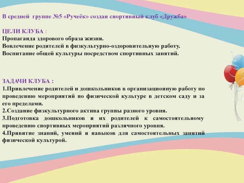 Слайд 12В средней группе №5 «Ручеёк» создан спортивный клуб «Дружба»