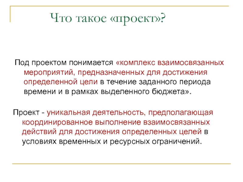 Проект - уникальная деятельность, предполагающая координированное выполнение взаимосвязанных действий для достижения определенных целей в условиях временных и ресурсных ограничений.