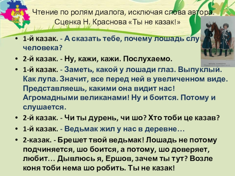 2-казак. - Брешет твой ведьмак! Лошадь не потому подчиняется, шо боится, а потому, шо доверяет, любит… Дывлюсь я, Ершов, зачем ты тут? Возле коня тоби нема шо робить. Ты не казак!