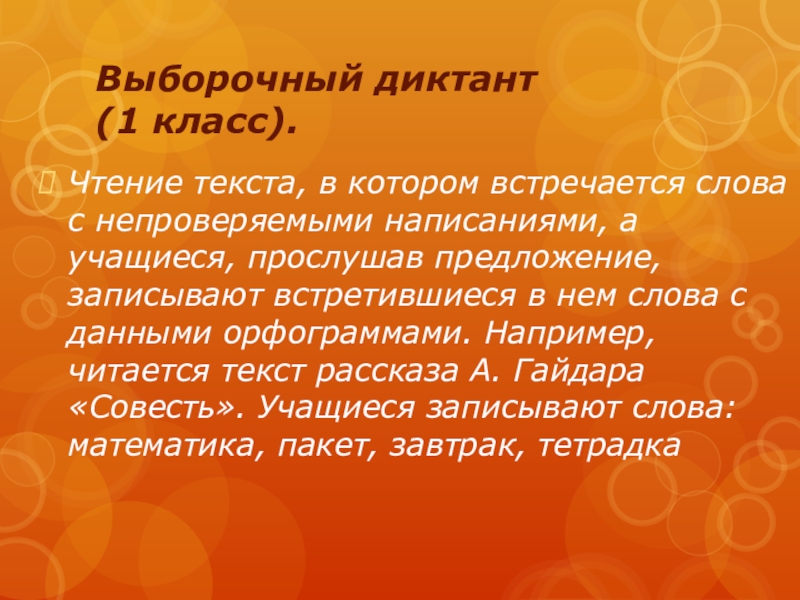 Выборочный диктант (1 класс). Чтение текста, в котором встречается слова с непроверяемыми написаниями, а учащиеся, прослушав предложение, записывают встретившиеся в нем слова с данными орфограммами. Например, читается текст рассказа А. Гайдара «Совесть». Учащиеся записывают слова: