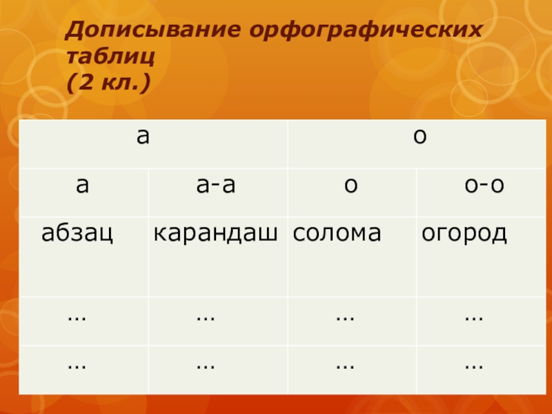 Слайд 8Дописывание орфографических таблиц (2 кл.)