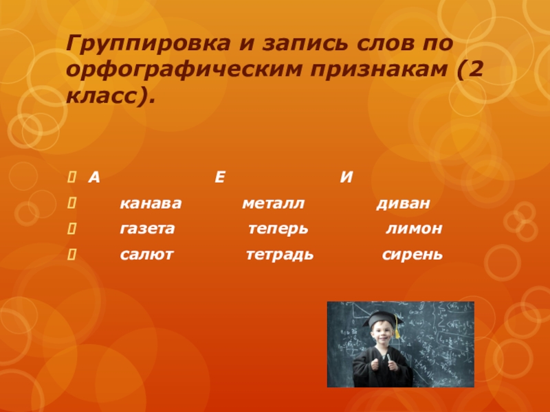 Слайд 4Группировка и запись слов по орфографическим признакам (2 класс).