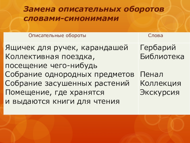 Слайд 10Замена описательных оборотов словами-синонимами