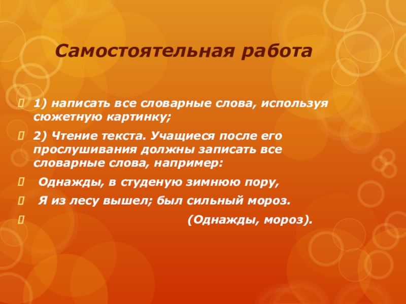 Самостоятельная работа 1) написать все словарные слова, используя сюжетную картинку;2) Чтение текста. Учащиеся после его прослушивания