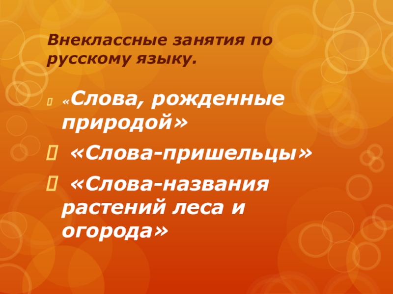 Внеклассные занятия по русскому языку. «Слова, рожденные природой» «Слова-пришельцы» «Слова-названия растений леса и огорода»