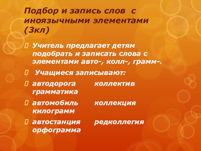 Подбор и запись слов с иноязычными элементами (3кл) Учитель предлагает детям подобрать и записать слова с элементами