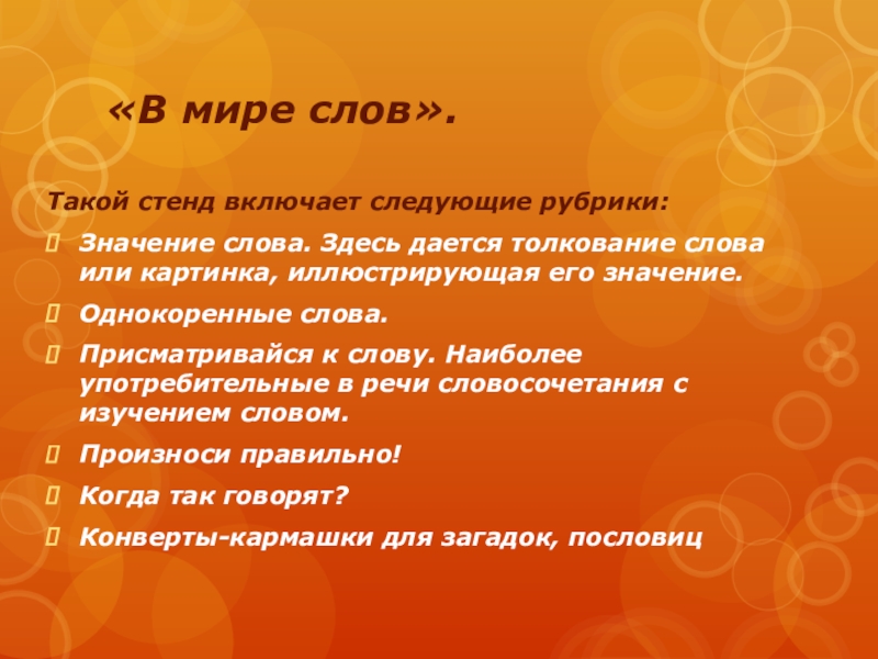 «В мире слов».Такой стенд включает следующие рубрики:Значение слова. Здесь дается толкование слова или картинка, иллюстрирующая его значение.Однокоренные
