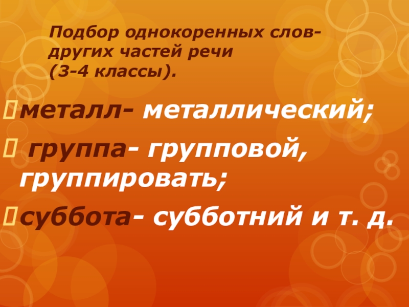 Подбор однокоренных слов- других частей речи  (3-4 классы).металл- металлический; группа- групповой, группировать; суббота- субботний и т.