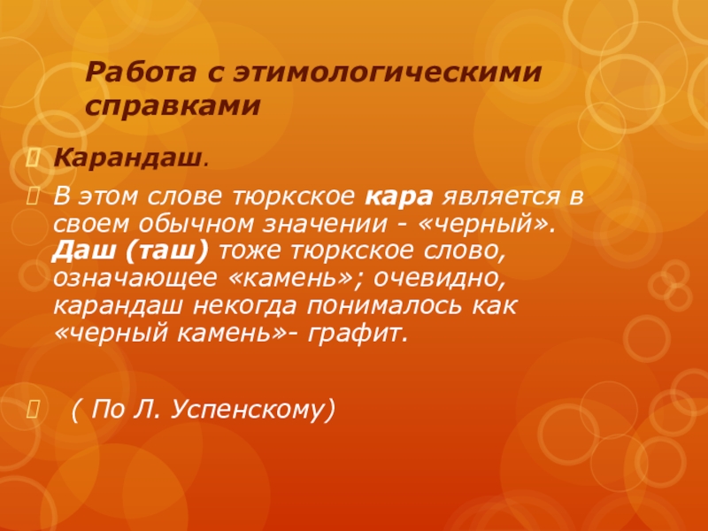 Работа с этимологическими справкамиКарандаш. В этом слове тюркское кара является в своем обычном значении - «черный». Даш