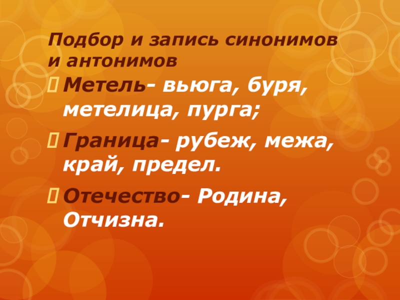 Подбор и запись синонимов и антонимовМетель- вьюга, буря, метелица, пурга;Граница- рубеж, межа, край, предел.Отечество- Родина, Отчизна.
