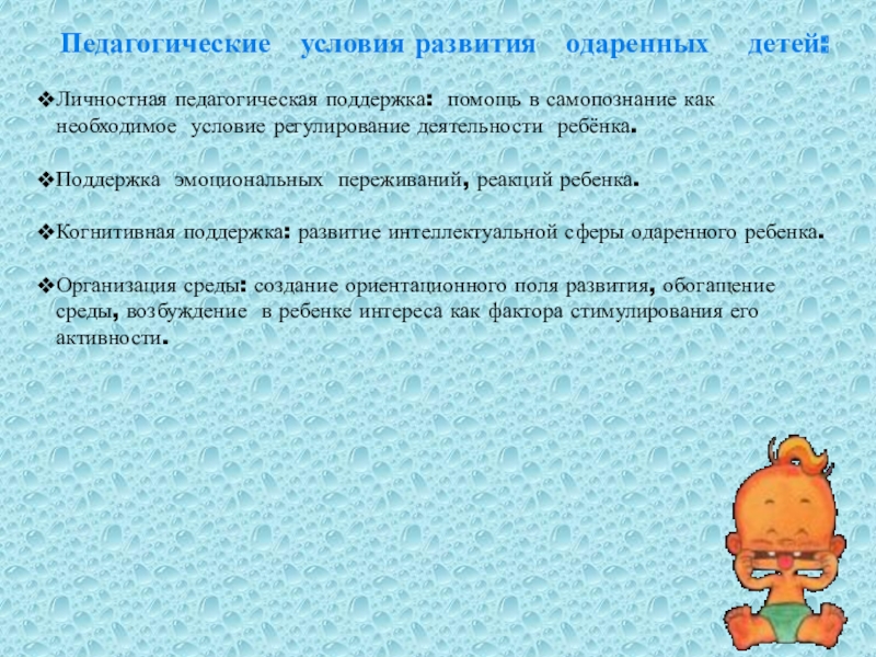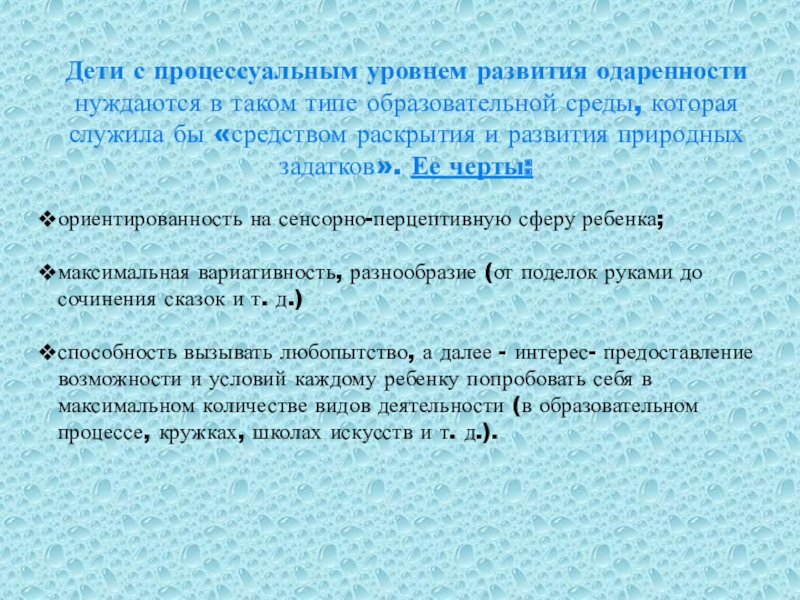 с одаренными детьми к созданию условий развивающей среды, которая способствовала бы раскрытию и оптимальному проявлению природы психики ребенка.