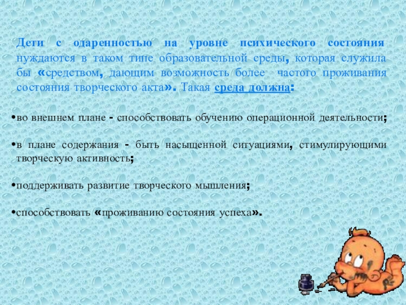Слайд 12Дети с одаренностью на уровне психического состояния нуждаются в таком типе