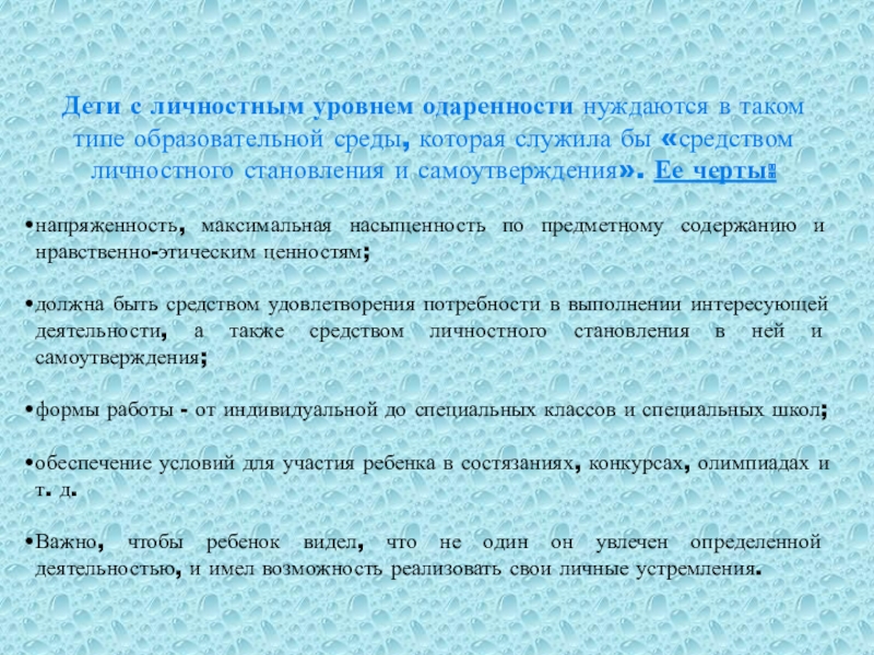 Слайд 13Дети с личностным уровнем одаренности нуждаются в таком типе образовательной среды,