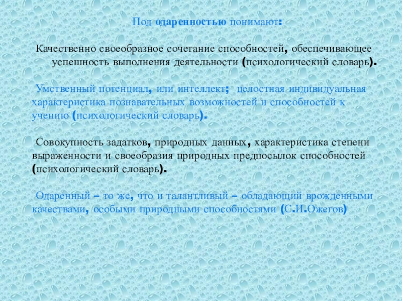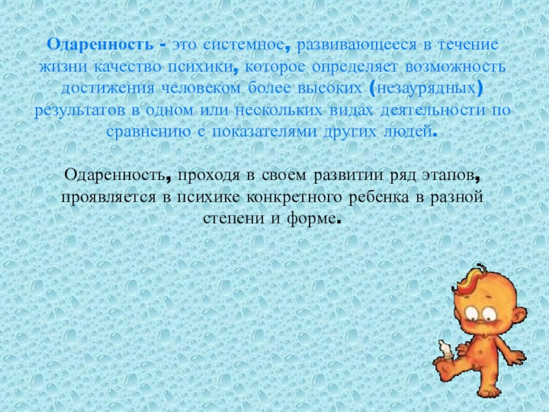 Слайд 6Одаренность - это системное, развивающееся в течение жизни качество психики, которое