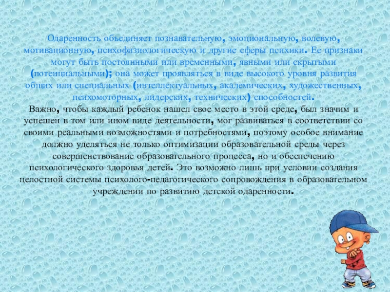 Важно, чтобы каждый ребенок нашел свое место в этой среде, был значим и успешен в том или ином виде деятельности, мог развиваться в соответствии со своими реальными возможностями и потребностями, поэтому особое внимание должно уделяться не только оптимизации образовательной среды через совершенствование образовательного процесса, но и обеспечению психологического здоровья детей. Это возможно лишь при условии создания целостной системы психолого-педагогического сопровождения в образовательном учреждении по развитию детской одаренности.