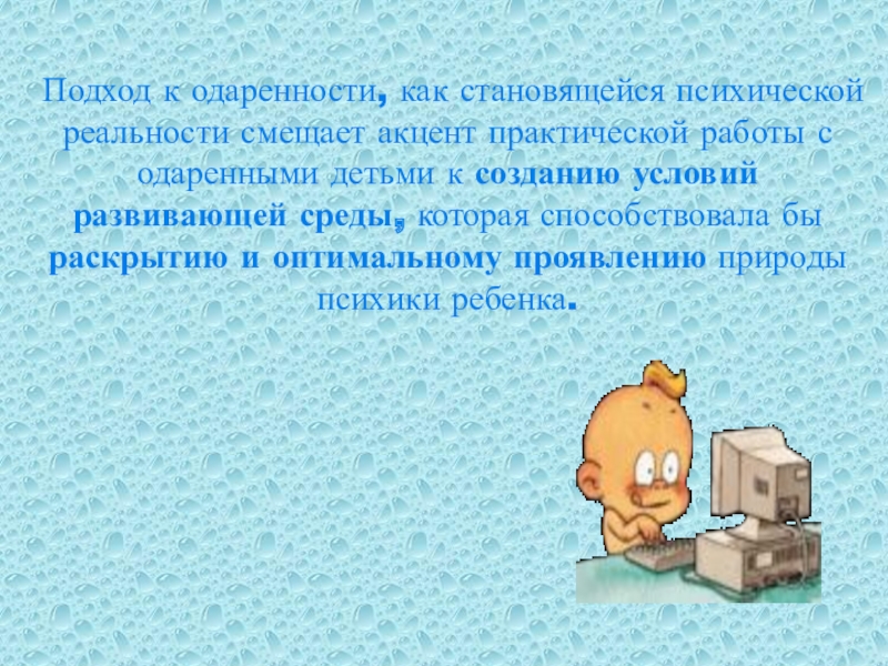 Слайд 10Подход к одаренности, как становящейся психической реальности смещает акцент практической работы