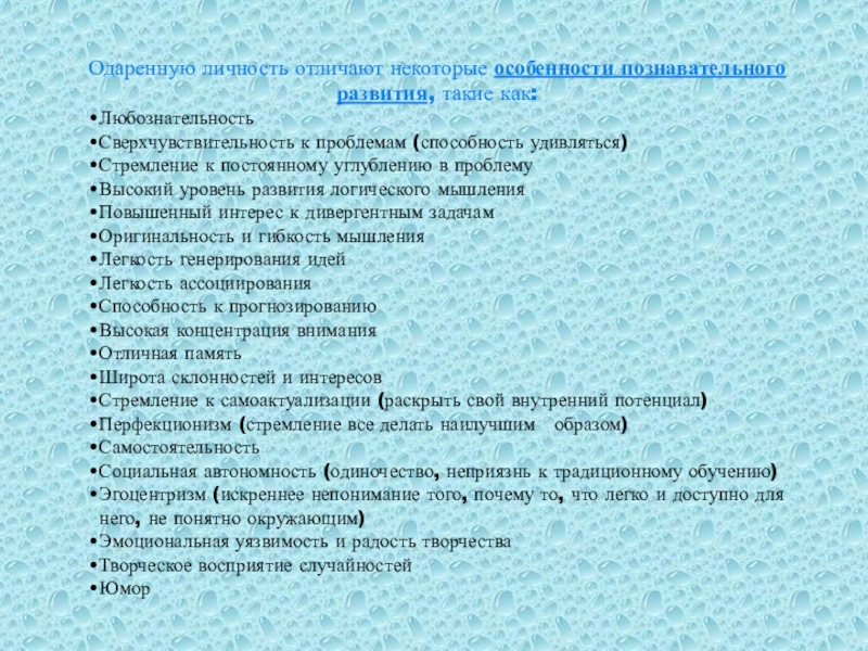 Слайд 9Одаренную личность отличают некоторые особенности познавательного развития, такие как: