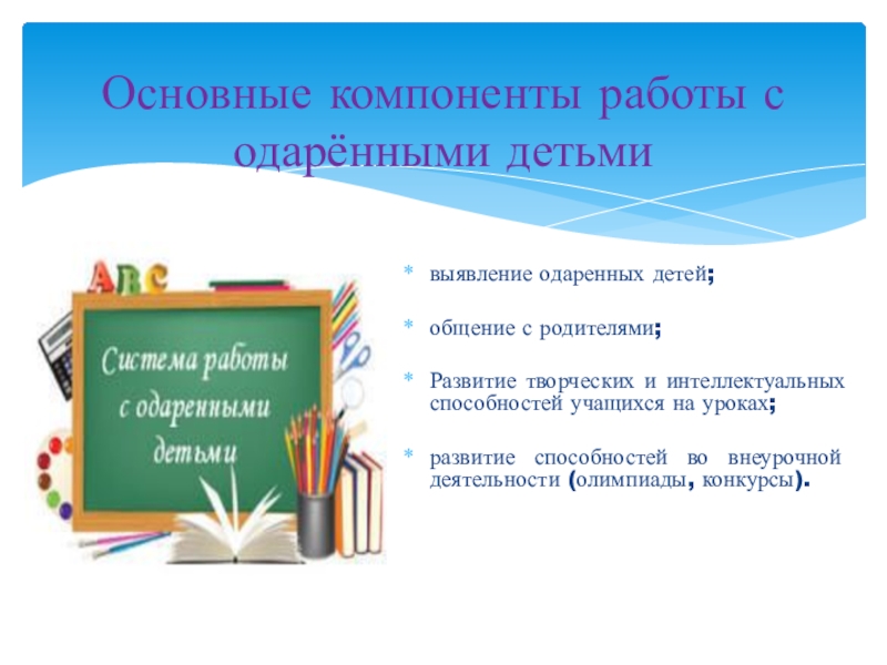 Основные компоненты работы с одарёнными детьмивыявление одаренных детей;общение с родителями; Развитие творческих и интеллектуальных способностей учащихся на
