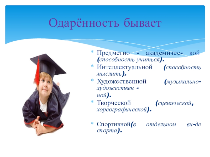 Одарённость бываетПредметно - академичес- кой (способность учиться).Интеллектуальной (способность мыслить).Художественной (музыкально-художествен -  ной).Творческой (сценической, хореографической).Спортивной(в отдельном ви-де