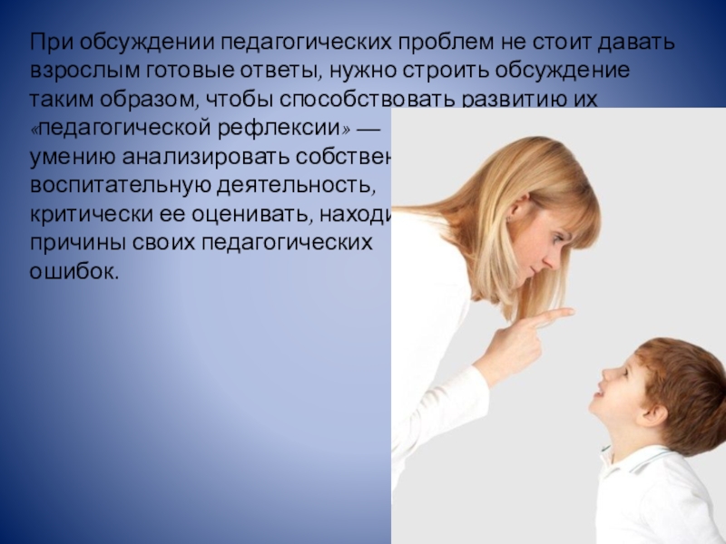 Слайд 13При обсуждении педагогических проблем не стоит давать взрослым готовые ответы, нужно