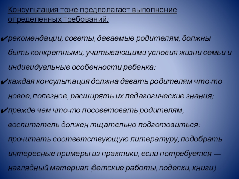 Слайд 23Консультация тоже предполагает выполнение определенных требований:
