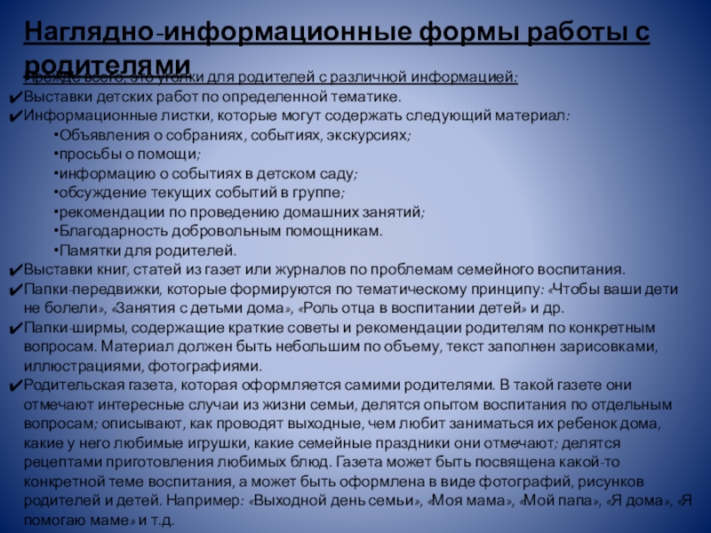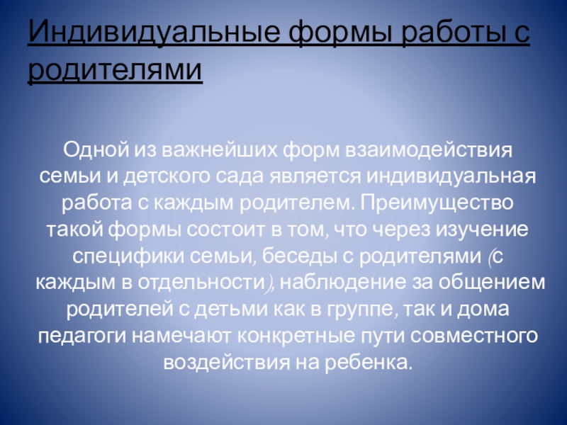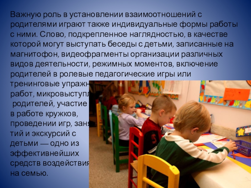 Слайд 11Важную роль в установлении взаимоотношений с родителями играют также индивидуальные формы