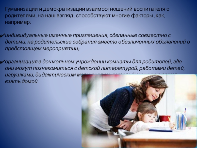 Слайд 9Гуманизации и демократизации взаимоотношений воспитателя с родителями, на наш взгляд, способствуют