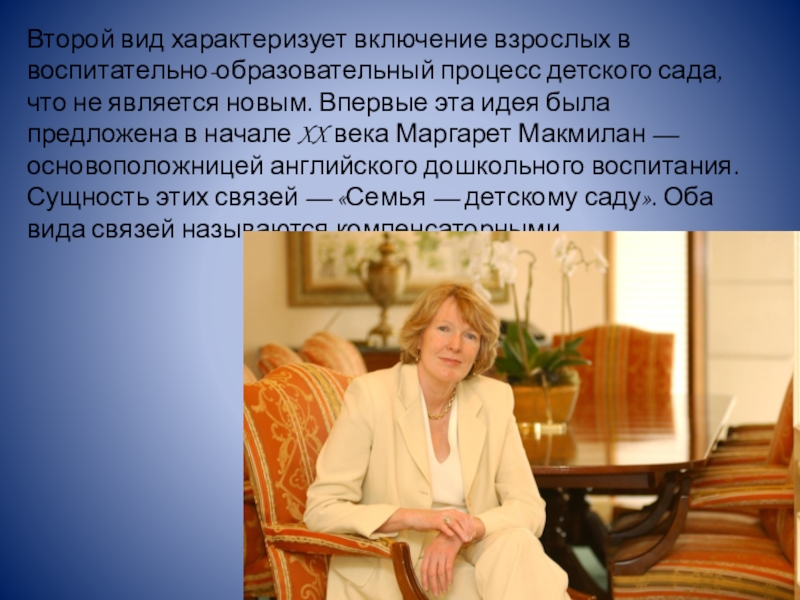 не является новым. Впервые эта идея была предложена в начале XX века Маргарет Макмилан — основоположницей английского дошкольного воспитания. Сущность этих связей — «Семья — детскому саду». Оба вида связей называются компенсаторными.