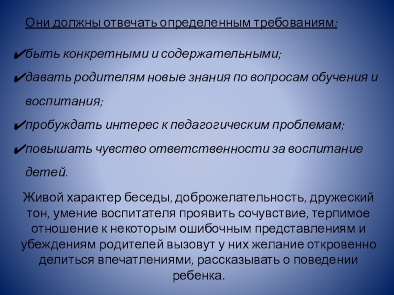 умение дать почувствовать родителям их значительность, проявление уважения к их мнению.