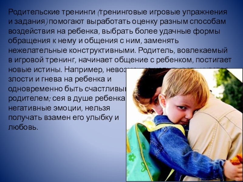 способам воздействия на ребенка, выбрать более удачные формы обращения к нему и общения с ним, заменять нежелательные конструктивными. Родитель, вовлекаемый в игровой тренинг, начинает общение с ребенком, постигает новые истины. Например, невозможно испытывать чувства злости и гнева на ребенка и