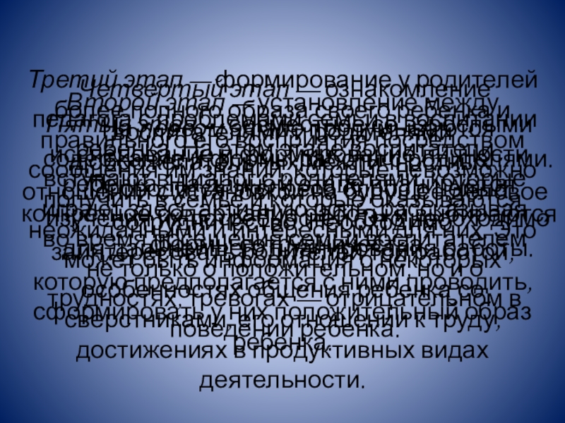Третий этап — формирование у родителей более полного образа своего ребенка и правильного его восприятия посредством сообщения им знаний, которые невозможно получить в семье и которые оказываются неожиданными и интересными для них. Это может быть информация о некоторых особенностях общения ребенка со сверстниками, его отношении к труду, достижениях в продуктивных видах деятельности.