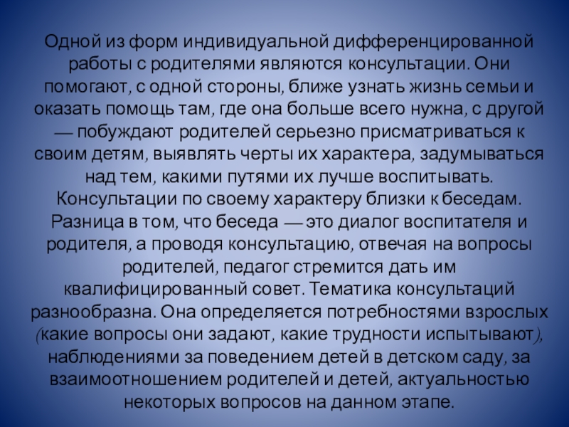 Слайд 22Одной из форм индивидуальной дифференцированной работы с родителями являются консультации. Они