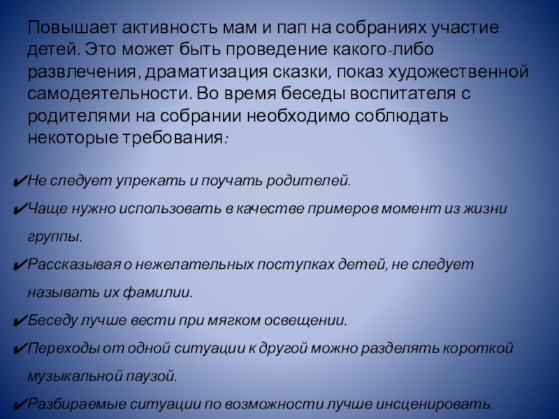 быть проведение какого-либо развлечения, драматизация сказки, показ художественной самодеятельности. Во время беседы воспитателя с родителями на собрании необходимо соблюдать некоторые требования: