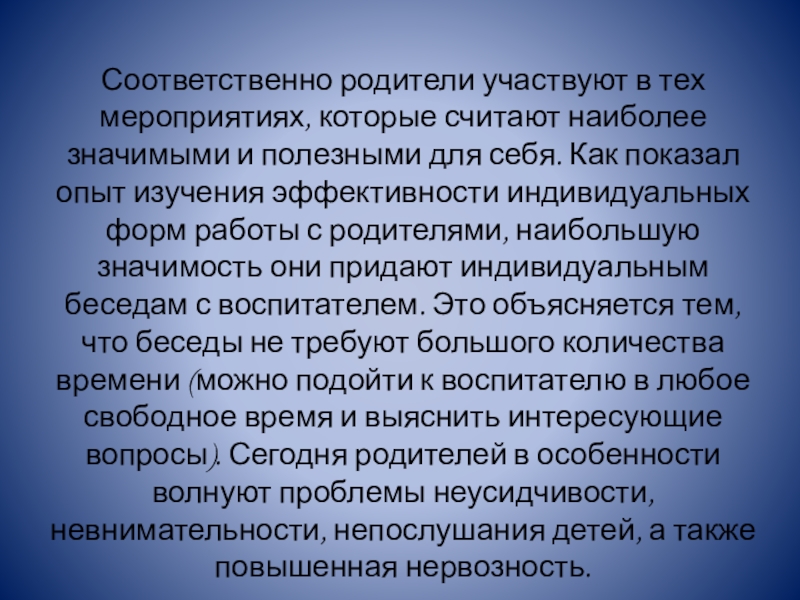 полезными для себя. Как показал опыт изучения эффективности индивидуальных форм работы с родителями, наибольшую значимость они придают индивидуальным беседам с воспитателем. Это объясняется тем, что беседы не требуют большого количества времени (можно подойти к воспитателю в любое свободное время и выяснить интересующие вопросы). Сегодня родителей в особенности волнуют проблемы неусидчивости, невнимательности, непослушания детей, а также повышенная нервозность.
