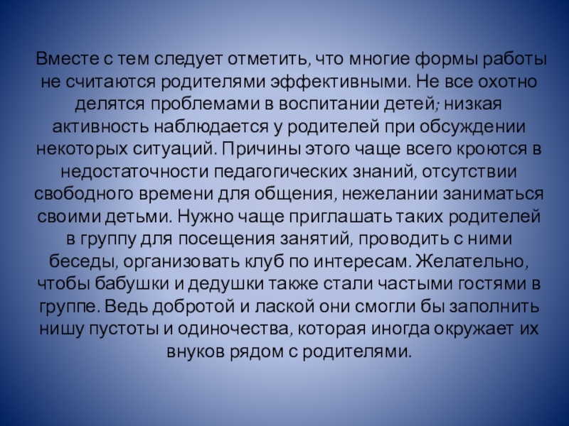 родителями эффективными. Не все охотно делятся проблемами в воспитании детей; низкая активность наблюдается у родителей при обсуждении некоторых ситуаций. Причины этого чаще всего кроются в недостаточности педагогических знаний, отсутствии свободного времени для общения, нежелании заниматься своими детьми. Нужно чаще приглашать таких родителей в группу для посещения занятий, проводить с ними беседы, организовать клуб по интересам. Желательно, чтобы бабушки и дедушки также стали частыми гостями в группе. Ведь добротой и лаской они смогли бы заполнить нишу пустоты и одиночества, которая иногда окружает их внуков рядом с родителями.