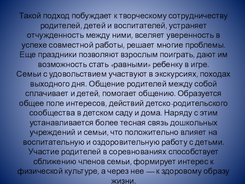 Семьи с удовольствием участвуют в экскурсиях, походах выходного дня. Общение родителей между собой сплачивает и детей, помогает общению. Образуется общее поле интересов, действий детско-родительского сообщества в детском саду и дома. Наряду с этим устанавливается более тесная связь дошкольных учреждений и семьи, что положительно влияет на воспитательную и оздоровительную работу с детьми. Участие родителей в соревнованиях способствует сближению членов семьи, формирует интерес к физической культуре, а через нее — к здоровому образу жизни.