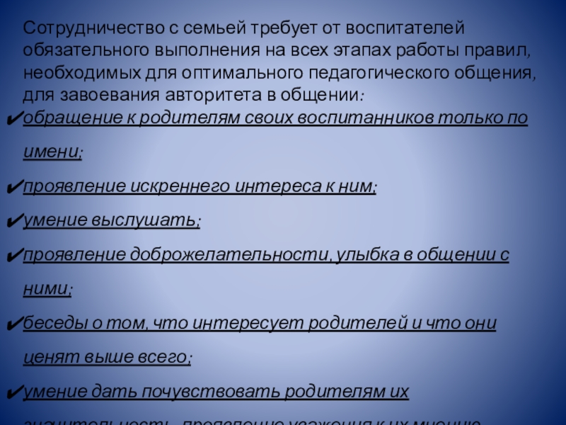 Слайд 8Сотрудничество с семьей требует от воспитателей обязательного выполнения на всех этапах