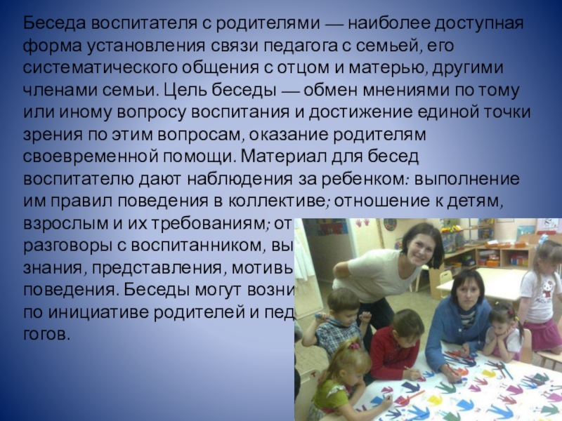 с семьей, его систематического общения с отцом и матерью, другими членами семьи. Цель беседы — обмен мнениями по тому или иному вопросу воспитания и достижение единой точки зрения по этим вопросам, оказание родителям своевременной помощи. Материал для бесед воспитателю дают наблюдения за ребенком: выполнение им правил поведения в коллективе; отношение к детям, взрослым и их требованиям; отношение к деятельности; разговоры с воспитанником, выявляющие его
