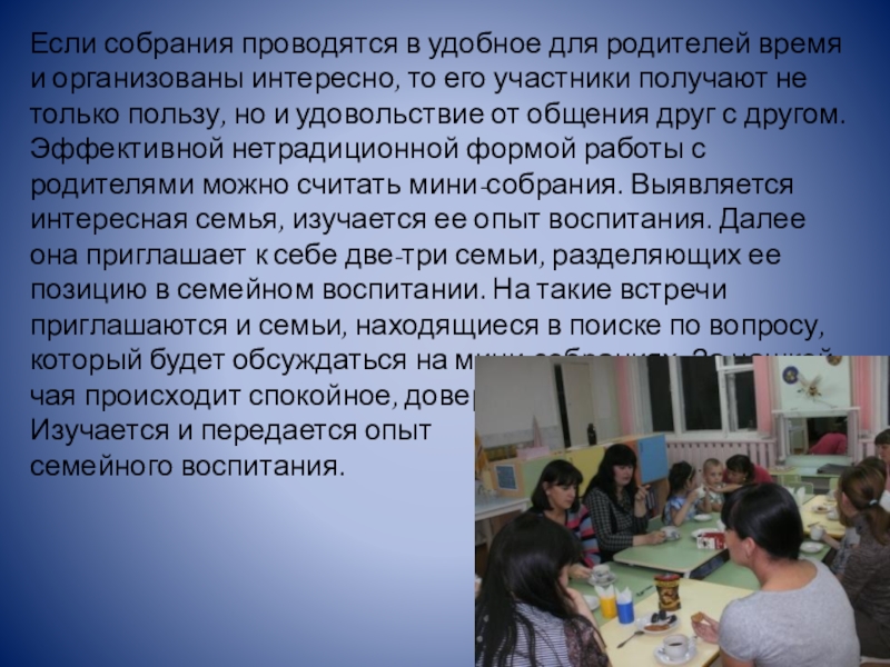 Эффективной нетрадиционной формой работы с родителями можно считать мини-собрания. Выявляется интересная семья, изучается ее опыт воспитания. Далее она приглашает к себе две-три семьи, разделяющих ее позицию в семейном воспитании. На такие встречи приглашаются и семьи, находящиеся в поиске по вопросу, который будет обсуждаться на мини-собраниях. За чашкой чая происходит спокойное, доверительное общение.