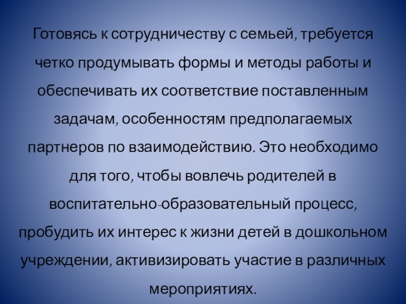 Слайд 14Готовясь к сотрудничеству с семьей, требуется четко продумывать формы и методы