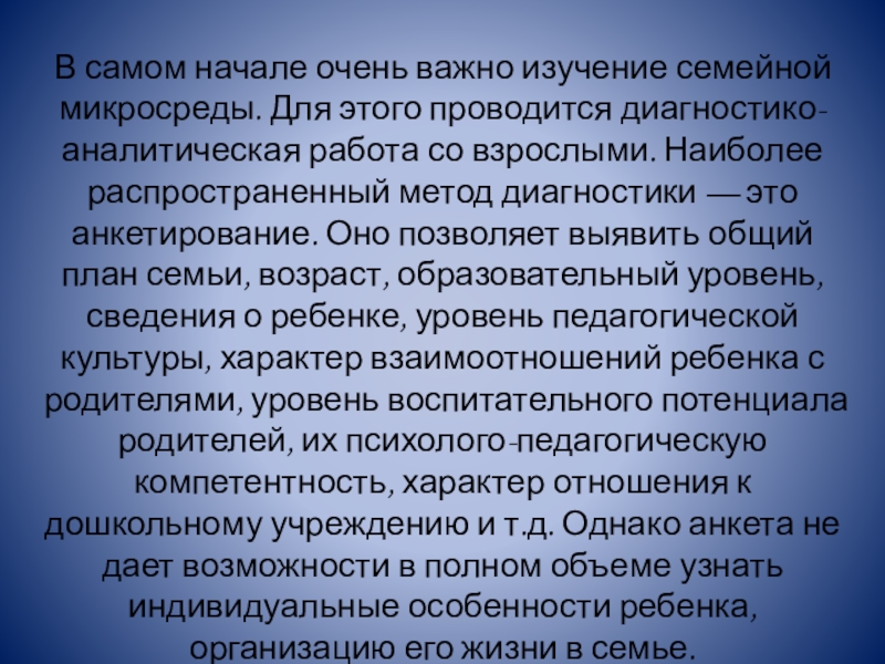 диагностико-аналитическая работа со взрослыми. Наиболее распространенный метод диагностики — это анкетирование. Оно позволяет выявить общий план семьи, возраст, образовательный уровень, сведения о ребенке, уровень педагогической культуры, характер взаимоотношений ребенка с родителями, уровень воспитательного потенциала родителей, их психолого-педагогическую компетентность, характер отношения к дошкольному учреждению и т.д. Однако анкета не дает возможности в полном объеме узнать индивидуальные особенности ребенка, организацию его жизни в семье.