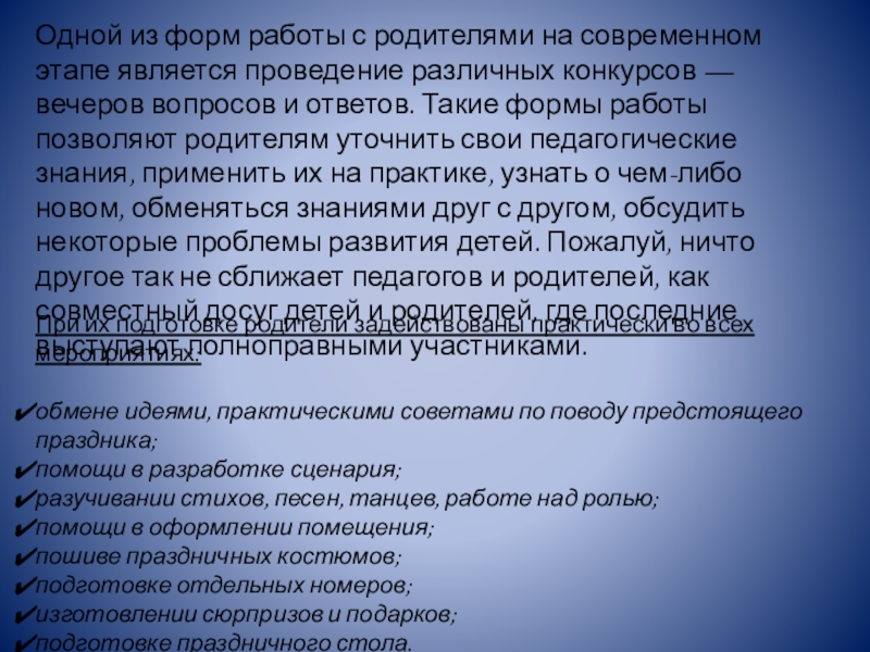 различных конкурсов — вечеров вопросов и ответов. Такие формы работы позволяют родителям уточнить свои педагогические знания, применить их на практике, узнать о чем-либо новом, обменяться знаниями друг с другом, обсудить некоторые проблемы развития детей. Пожалуй, ничто другое так не сближает педагогов и родителей, как совместный досуг детей и родителей, где последние выступают полноправными участниками.